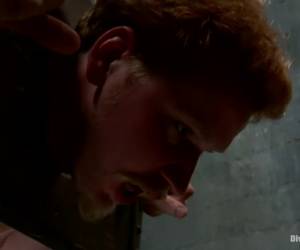 Haar blanke gezicht zit onder de witte sperma, die uit de neger lul is gespoten.